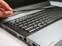 Flip the computer over and insert the plastic opening tool under the plastic strip at the top of the keyboard.