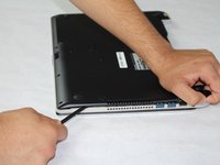 Run a spudger along both sides of the laptop to widen the separation and release the clips holding the back case on.
