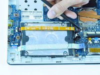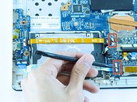 Use the point end of the spudger to lift the the clips that attach the two ribbons to the motherboard.