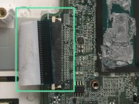 Remove the cable connecting the keyboard to the motherboard. Lift the tape holding the cable to the connector, then use a spudger to press out the two small tabs on either side of the cable side connector in a walking motion, alternating one side then the other.