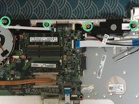 Remove the motherboard, taking care with the speaker cables, the various cables, and any fasteners bordering the sides of the motherboard.
