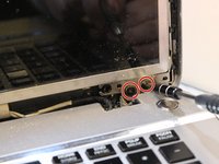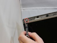 Open the laptop and unscrew each of the screws that are in the corners of the screen using a Phillips #1 screwdriver.