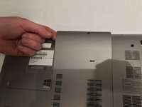 Turn laptop upside down with the spine facing towards you and locate the two tabs on the top of the back panel.