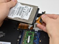Gently lift the hard drive from the left side and disconnect the SATA connector from the right side. Completely remove the hard drive.