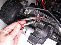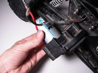 Pull the black power wire in an outward motion on both sides of the clear plastic sleeve to disconnect the motor from the battery. Repeat this with the red power wire to disconnect it from the battery.