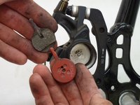 Slide out the back brake pad first. Then slide out the front brake pad.