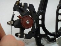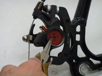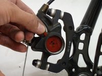 Push the spring back into place between the two brake pads so the spring is visible in the hole shown here.