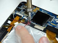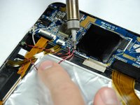 Use the soldering iron to melt away the solder from the red and black wires that connect the speaker to the motherboard.
