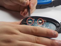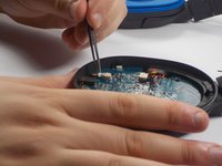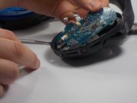 • Gently removed and flip over circuit board to reveal battery pack attached to the underside. Careful not to pull out wires running through headband.