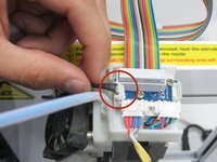 Locate the fan connector, a 2-pin JST type, from the extruder board on the top of the extruder assembly and while firmly holding the plastic part of the connector, wiggle out the wire.