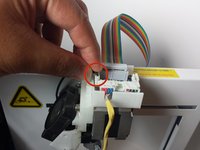 Remove the plastic cover that sits on the extruder, next to the fan, by lifting the latches in the back. The latches should lift right out.