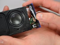 Using the standard metal spudger, begin by prying at the bottom of the plain rubber end cap (the end without the USB or auxiliary input).