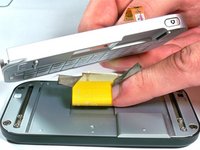 Pry the silver cover off the screen enclosure. The display cable should be pulled through the opening in the silver cover.