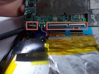 Peel up the grey tape so that you can get to the board and untape the ribbon cable that was removed from the motherboard in the previous step.