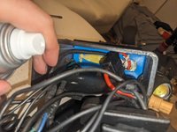 • Apply an ample amount of WD-40 to all 4 sides of the battery. As we can not get a grip on the battery, you can either VERY GENTLY use the prying tool to pull it out (stop at ANY resistance) or you can pull on the red and black wire attached to the DC converter.