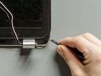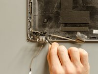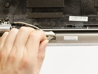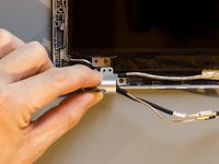 Release now the display cable from its routing channel up to the left hinge. Pull it out using your hands and by getting round the plastic clips.
