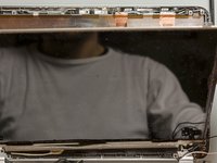 Once you have pried the service door off as it is in pic#3, it will come out of the rear edge very easily.