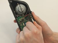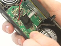 Using a portable soldering iron, melt the solder on the black speaker wires on the logic board.
