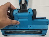 Loop the black rubber belt around the notched wheel on the right side of the brush, then place the brush roll back in its housing and lock the white plastic latch.