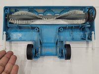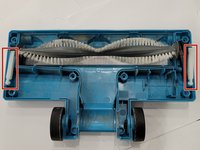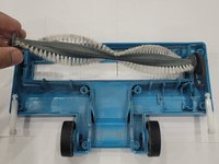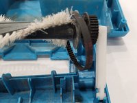 Before replacing the top of the brush housing, make sure the black rubber belt is secured around the black notched wheel on the right side of the brush, as well as the notched wheel on the motor.
