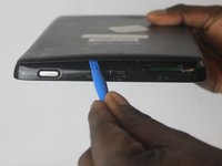 Insert the plastic opening tool in the SD port. The edge point should be pointed towards the rear panel.