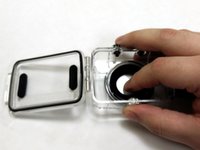 This guide provides instructions for removal of the glass lens cover on the front of the camcorder's water proof case. There are small screws and a glass part in this repair, so have a clean work space and keep the case on a flat surface to avoid losing screws or dropping the glass lens cover.