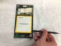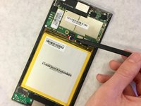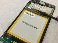 To remove adhesive, insert the flat end of the plastic spudger under the battery. Slide it toward the top of the device until the battery pops free.