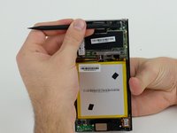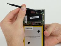 Obtain the black plastic spudger tool from the iFixit toolkit. Position the device as shown in the picture. Insert the flat end of the spudger directly in the space above the power button between the back cover and front screen.
