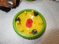 On pictures two and three you see the parts of the wheel, the black rolls and the metal axles and how to put them on the yellow part.