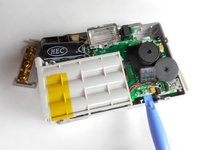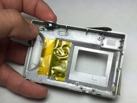 Remove the shutter button by gently pressing the button from the top, pushing it towards the inside of the camera. Press shutter button down and wiggle slightly until the shutter button comes loose from housing.