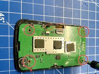 Remove the remaining pieces of the old battery connectors from the two main pads. Be careful not to rip off the pads from the circuit board.
