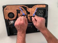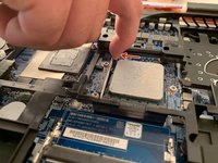 Carefully pull the metal bar away from the processor to free it from under the retaining tab, then lift it to release the processor pins.