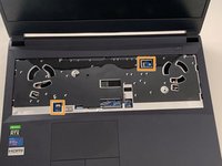 Lift the retaining latches and remove the two ribbon cables located under the keyboard.