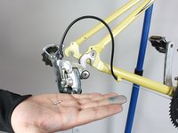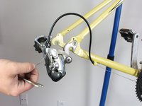 Loosen the hex nut, as shown, on the side of the derailleur. This bolt plays a key role in securing the derailleur cable which we will need to cut in step two.