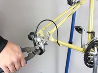 Using a pair of wire cutters, locate the end of the derailleur cable. Cut the wire just below the cap, cutting off the metal end piece.