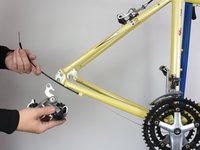 Using a hex key wrench, unscrew the bolt that fastens the derailleur to the bike frame. The derailleur should come off easily because it is no longer fastened to the bike and the derailleur cable can easily slip out.