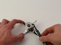 Using a flat head screwdriver and a mallet, bend down the two tabs holding the large nut.