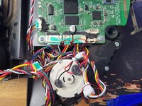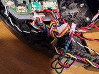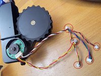 • For the left wheel, two of the sockets for these plugs are under the motherboard. Two others are tucked under the motherboard, and the 5th connector goes to the bin sensor behind the wheel assembly.