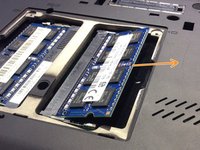 Once the RAM is at the angle as shown in picture 2, remove the RAM by pulling it out of the computer, as shown by the orange arrow.