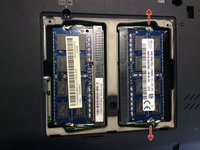 Remove the two clips from the RAM by pulling them slowly in the direction shown by the red arrows. When both clips are released, the RAM will lift up at a 45 degree angle (picture 2).