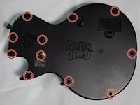 • Open the body of the guitar by unscrewing 11 10 mm screws from the circled screw holes with a Torx T10 screwdriver.