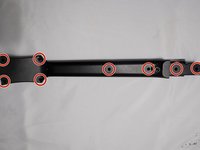 • Using a Torx T10 screwdriver, unscrew the eight 10 mm screws along the circled screw holes to take the backing off the guitar's neck.