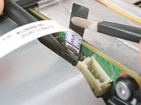• Use the flat end of a spudger to scrape up a corner of the larger sticker until you can grip it with a pair of blunt tweezers.