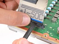 • Pinch the locking tab on the interconnect cable on the motherboard and use the flat end of a spudger to disengage the clip.