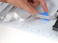 Use the flat end of a spudger to scrape up a corner of the larger sticker until you can grip it with a pair of blunt tweezers.