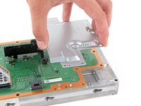 Hold the power supply cable out of the way and lift the board shield straight up to remove it.