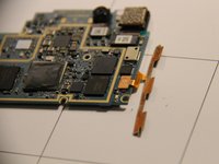 Separate a cable ribbon from the top right of the motherboard - near the cable from the previous step - by gently inserting the pry tool under the rectangular metallic piece and lifting.