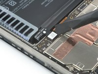 Use the flat end of a spudger to pry up and disconnect the battery cable at the bottom right corner of the motherboard.