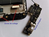 Replace the charger module by positioning it correctly in relation to the two small metal lugs located on the chassis (a small cylindrical point located at the top right and a small protrusion located just above and to the right of the micro USB connector)