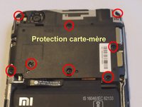 Remove the 8 mounting screws from the motherboard cover. One of them, located at the bottom left, is hidden by an opening indicator (small adhesive circle with the "MI" logo).